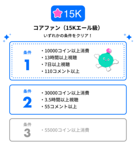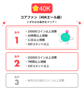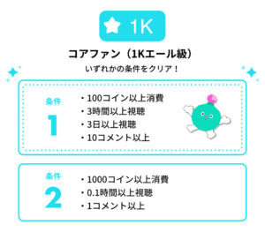 1Kエール級のコアファンになるためには次の画像にある条件1もしくは条件2を達成しなければいけません。