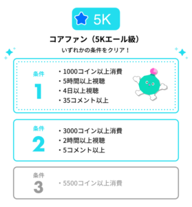5Kエール級のコアファンになるためには、条件1、2、3のどれかを達成する必要があります。