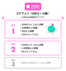 20Kエール級だと、最低でも20,000コインを得るのに17,300円の課金が必要ですし、その他の条件も160コメント以上など条件1でも難易度が高いです。
