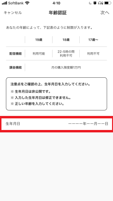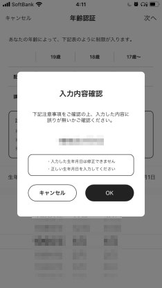 同意すると年齢確認があります。下の生年月日をタップして設定しましょう。