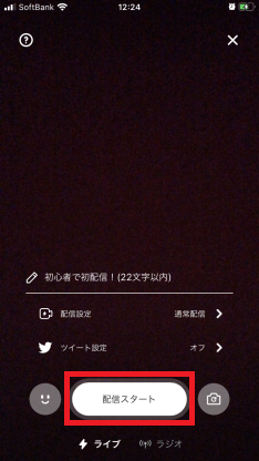 ラジオをタップすると、カメラを使わずに配信ができます。これで設定完了です。