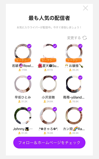 人気配信者の画面から次に進んでいただくとHOME画面に移りますのでログインは完了です。