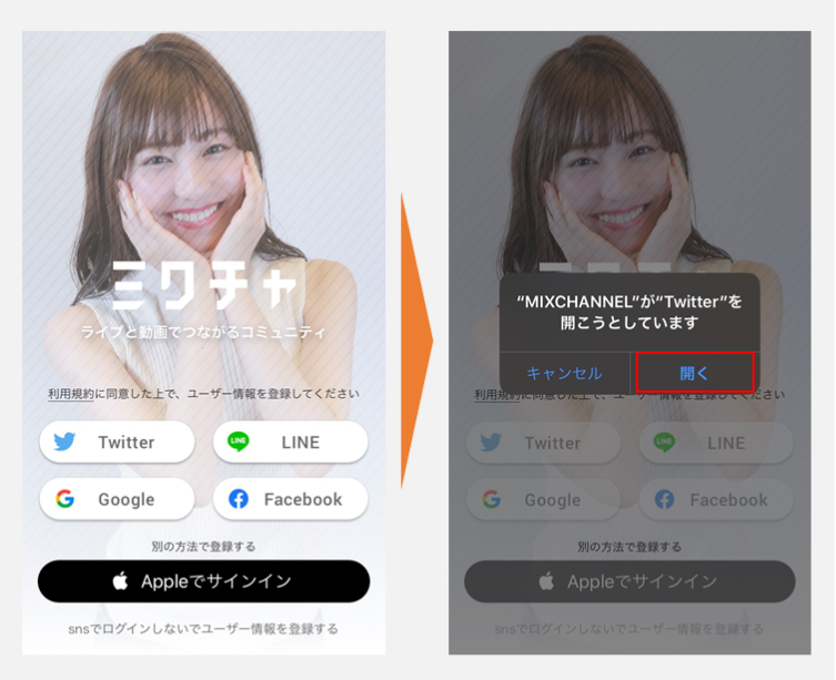 起動すると女性のトップ画面が映りますので、連携するSNSや既存サービスを選択します。